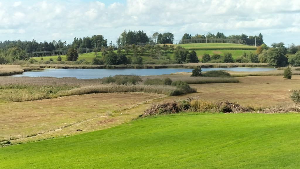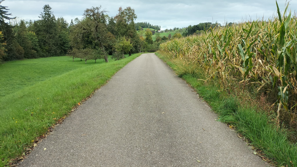 Der Weg führt hinein ins Hinterland, durch Obstwiesen und Hopfengärten. Gerade hier, im Raum Tettnang, bekommt die Landschaft einen eigenen Rhythmus: sanfte Hügel, kleine Höfe, viel Grün. Es ist kein spektakulärer Beginn, aber einer, der entschleunigt. Man kommt ins Gehen.
