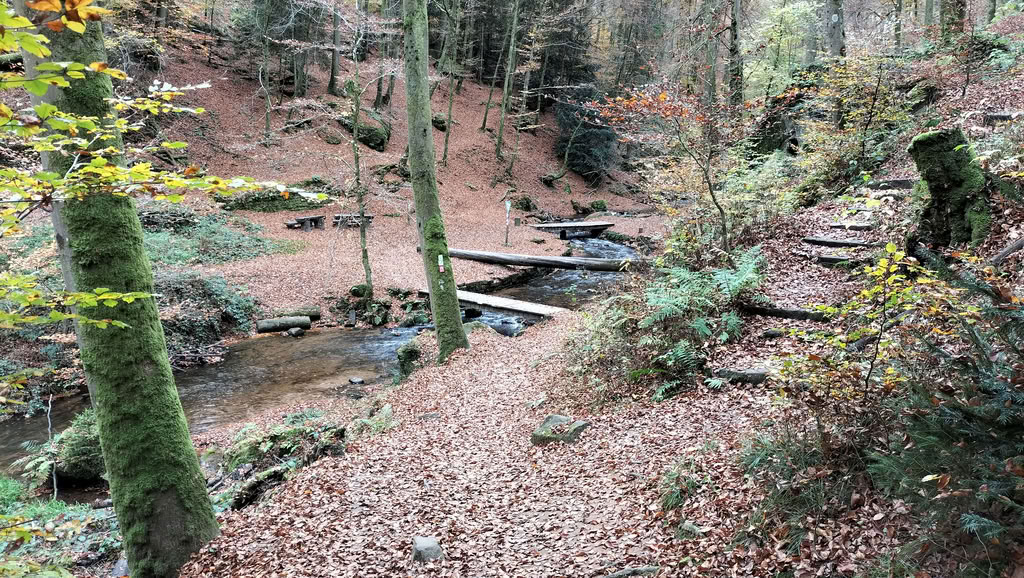 Diese Etappe führte mich zunächst von Dansenberg hinunter zum Naturfreundehaus Finsterbrunnental. Dort fließt die Moosalbe, die mich heute ein gutes Stück des Weges begleitete, bis hin zu ihrer Quelle. Ein weiterer Begleiter ist die Straße auf der anderen Flussseite und war nicht zu überhören. Ein besonderes Highlight war die malerische Karlstalschlucht, die mit ihrer beeindruckenden Naturkulisse beeindruckte. Nach der Quelle erreichte ich bald Johanniskreuz und schließlich Schwarzbach.