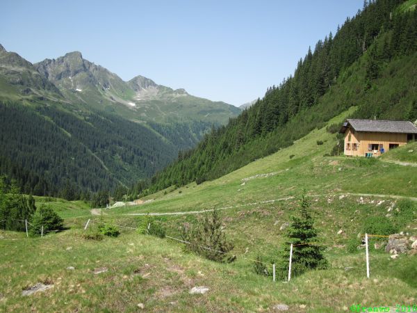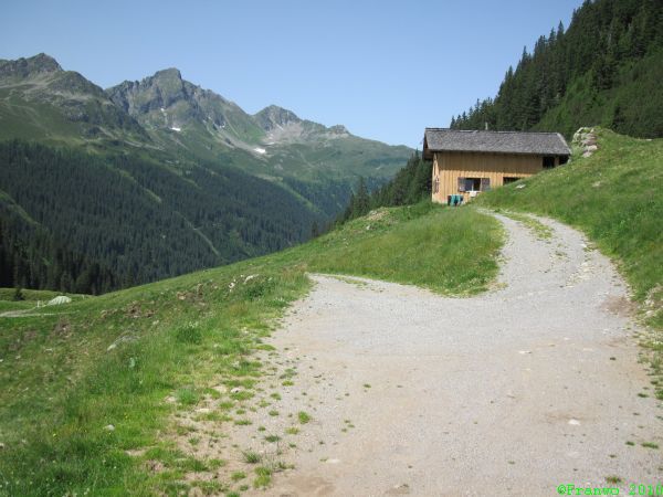 Die Hütte steht im Joch in 2400m Höhe. Danach führt mich der Weg im Nenzingasttal hinunter nach Langen am Arlberg, von wo ich die Rückreise mit dem Zug beginne.