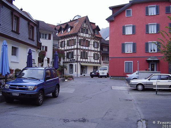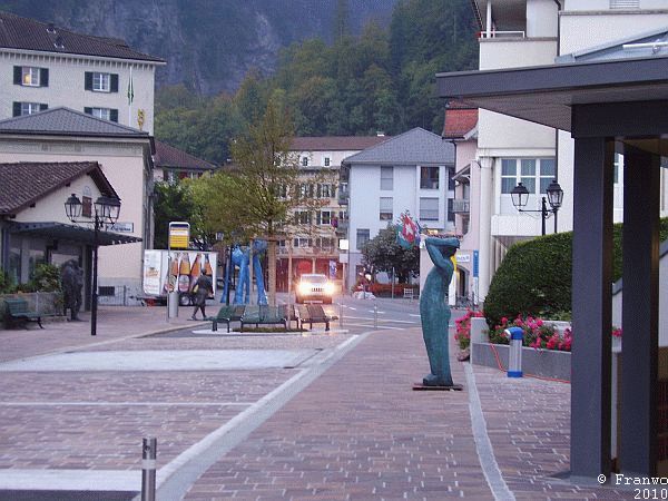 Früh am Morgen fuhr ich mit dem Zug nach Bad Ragaz. Hier begrüssten mich bunte und seltsame Figuren, welche in dem ganzen Ort aufgestellt waren. Der Weg führt gerade durch das kleine Zentrum zum Schluchtenweg.