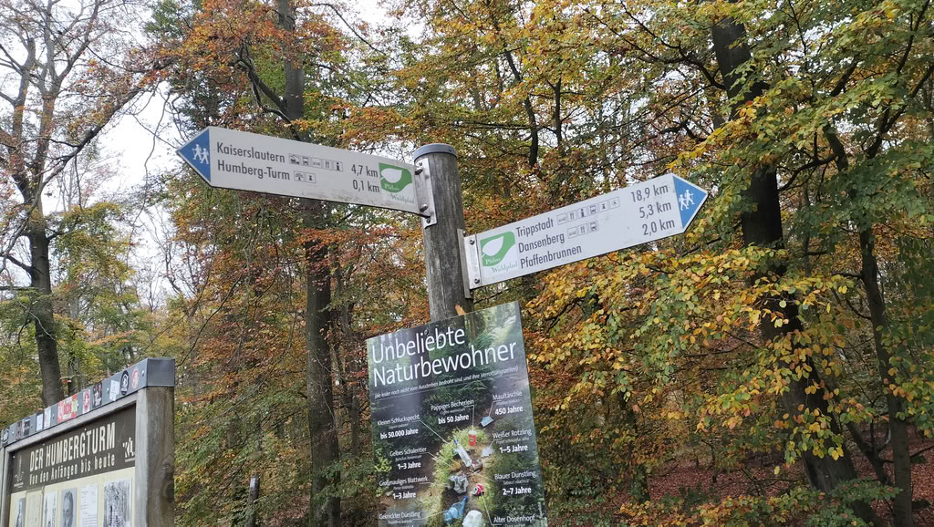Mein Zug kam gegen 12:00 Uhr in Kaiserslautern an. Dadurch war die erste Etappe mit etwa 10 Kilometern relativ kurz. Sie führte direkt vom Bahnhof hinaus aus der Stadt, hinein ins Grüne, und hinauf zum Humbergturm. Von dort war mein Tagesziel, Dansenberg, schnell erreicht.