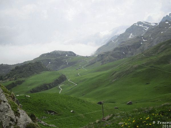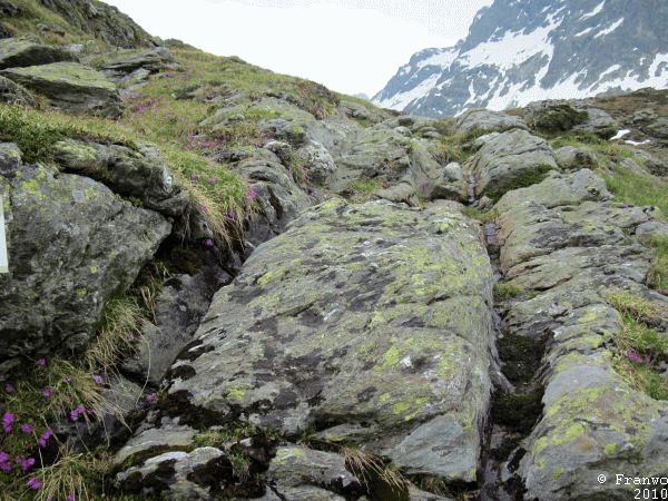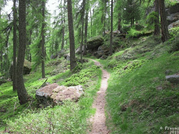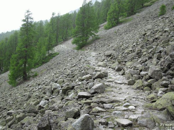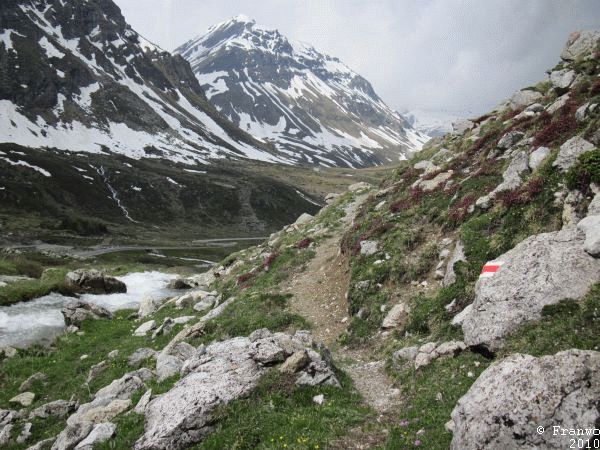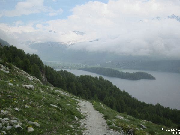 Der Wanderweg verläuft überwiegend in einem erträglichen Abstand zur Pass-Strasse, die richtige Ruhe des Hochgebirges darf man allderdings nicht erwarten. Auf Höhe des Julier Hospizes sind noch Karrenspuren tief im Fels, welche aus noch vorrömischer Zeit stammen. Beim Abstieg Richtung Silvaplana war der Weg oftmals von Schmelzwasserbächen überflutet, dass ich auch schon mal ein Stück barfuss ging. Oberhalb von Silvaplana ging ich auf der Via Engadina weiter Richtung Sils/Segl. Ab hier ging es nochmals hinauf nach Blaunca in 2037m Höhe. Leider drückten die Regenwolken aus dem Bergell ins Engadin, dass ich ohne Aussicht und im Nebel hinunter nach Maloja absteigen musste.