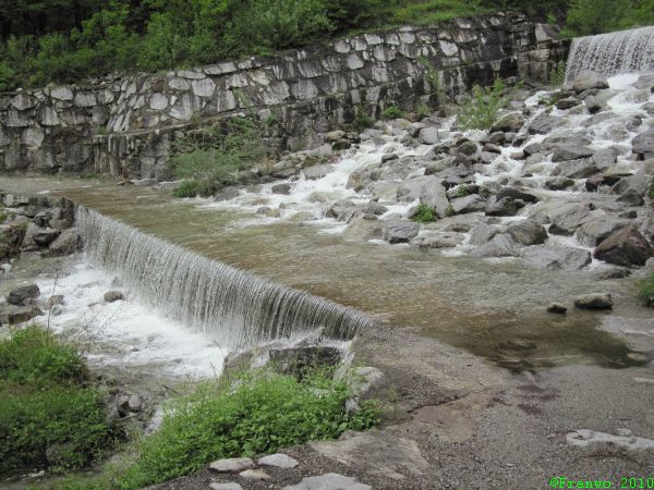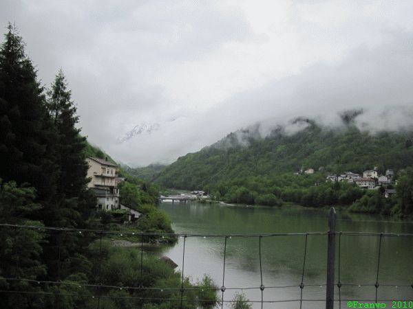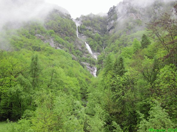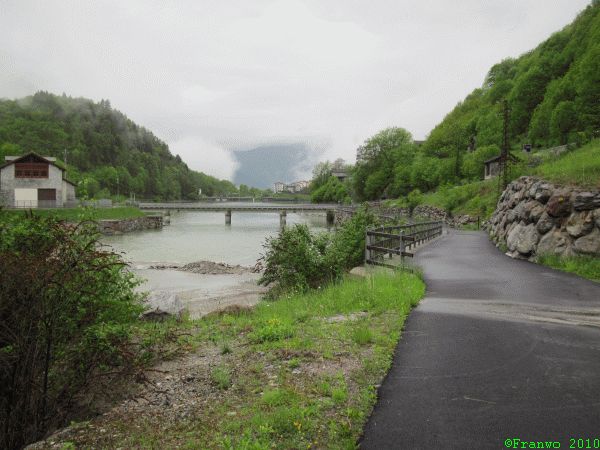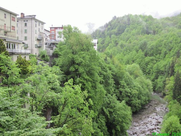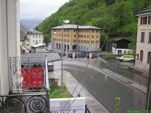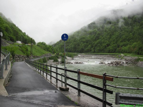 Es gab über Nacht neben dem Dauerregen auch noch ein Gewitter. Mit dem Moment, als wir das Hotel verliessen, hörte der Regen auf. Nach Überquerung der Grenze hatten wir nicht auf Anhieb unsren Wanderweg wiedergefunden. Wir hätten in Castasegna zum Autogrenzübergang gehen müssen. Dort unten ging der Weg am Fluss weiter.