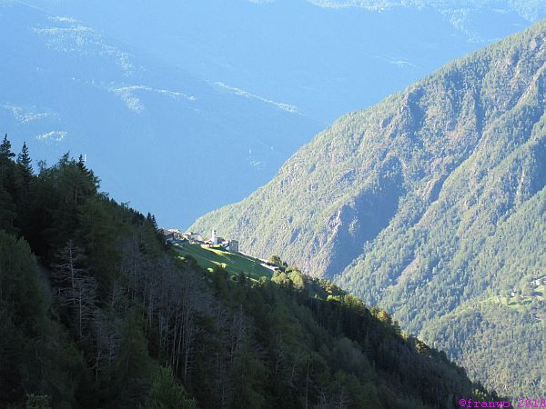 Die letzte Etappe! Vor uns liegen 100m Aufsteig und 1500m Abstieg. Ein strahlend blauer Morgenhimmel erwatet uns nach einem guten, und reichhaltigen Frühstück. Nach dem das letzte Lunchpaket in Empfang genommen wurde, geht es los. Zunächst laufen wir ein Stück auf dem Güterweg, dann auf Pfaden durch den Wald hinunter nach Viano. Nach Viano geht des zur italienischen Grenze 100m hinauf und dann steil bergab durch Kastaninenwälder und später durch Weinberge nach Tirano.