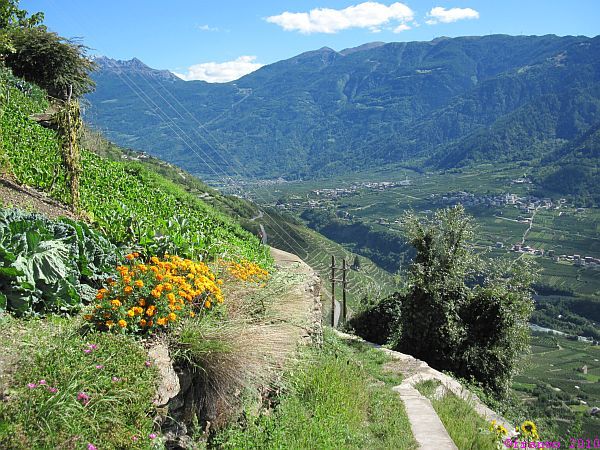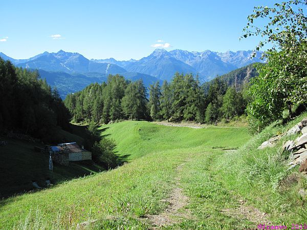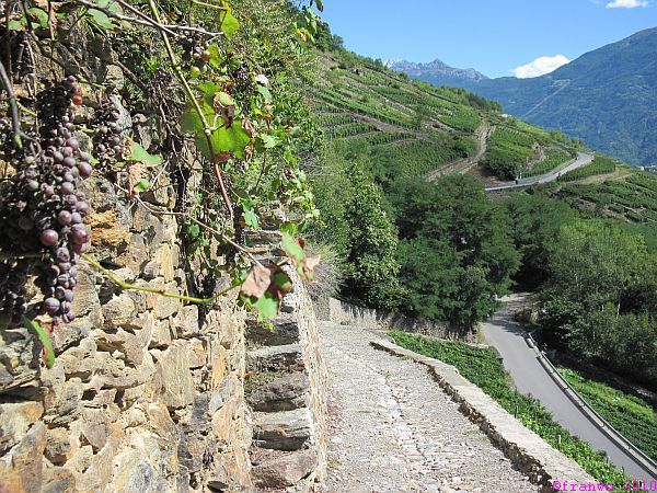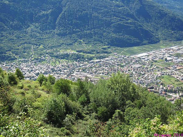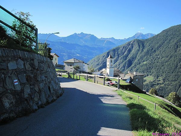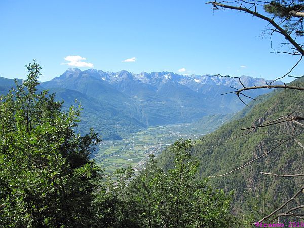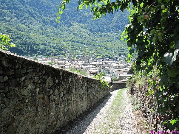 Wir bekommen im Norden immer wieder die gesamte Berninagruppe zu sehen. Im Süden grüssen uns die Bergamasker Alpen und San Romerio kann man noch lange in der Ferne erkennen. Wir haben ausgesprochen gutes Bergwetter. Kurz vor Tirano können wir uns mit den wild wachsenden Trauben am Wegesrand erfrischen. Wir sind im Süden angekommen!