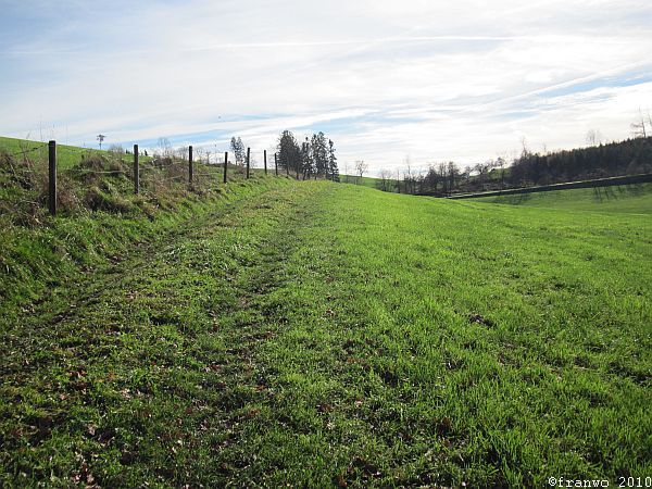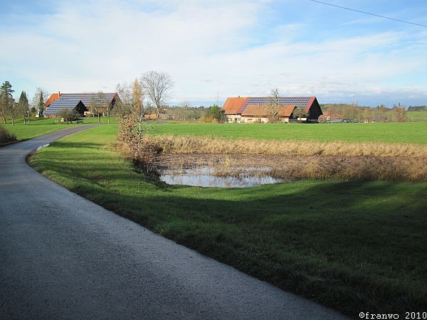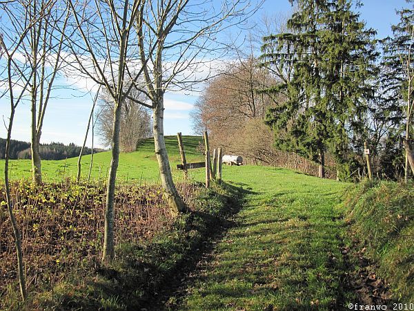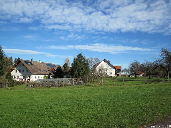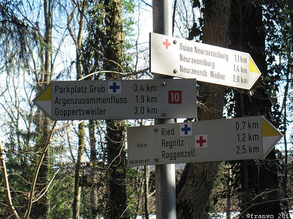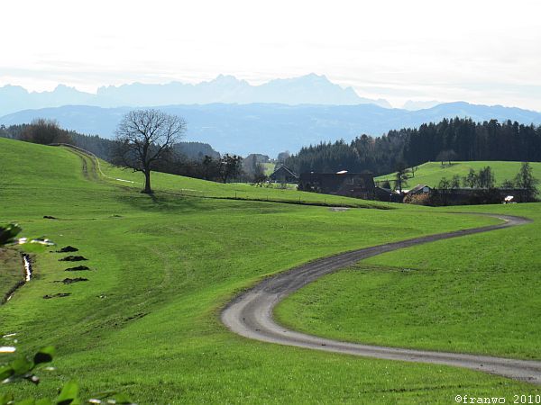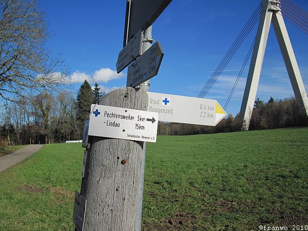 Meine heutige Wanderroute ist sehr angenehm zu wandern, ohne nennenswerte Steigungen geht es, mit teilweise traumhafter Aussicht auf Alpen und später auf den Bodensee, durch das wunderschöne Allgäu, abseits von verkehrsreichen Strassen, hinunter nach Lindau. Bis zur Argentalbrücke (Autobahn) ist die Markierung ein rotes Kreuz, danach führt das blaue Kreuz bis zur Stadtgrenze nach Lindau.